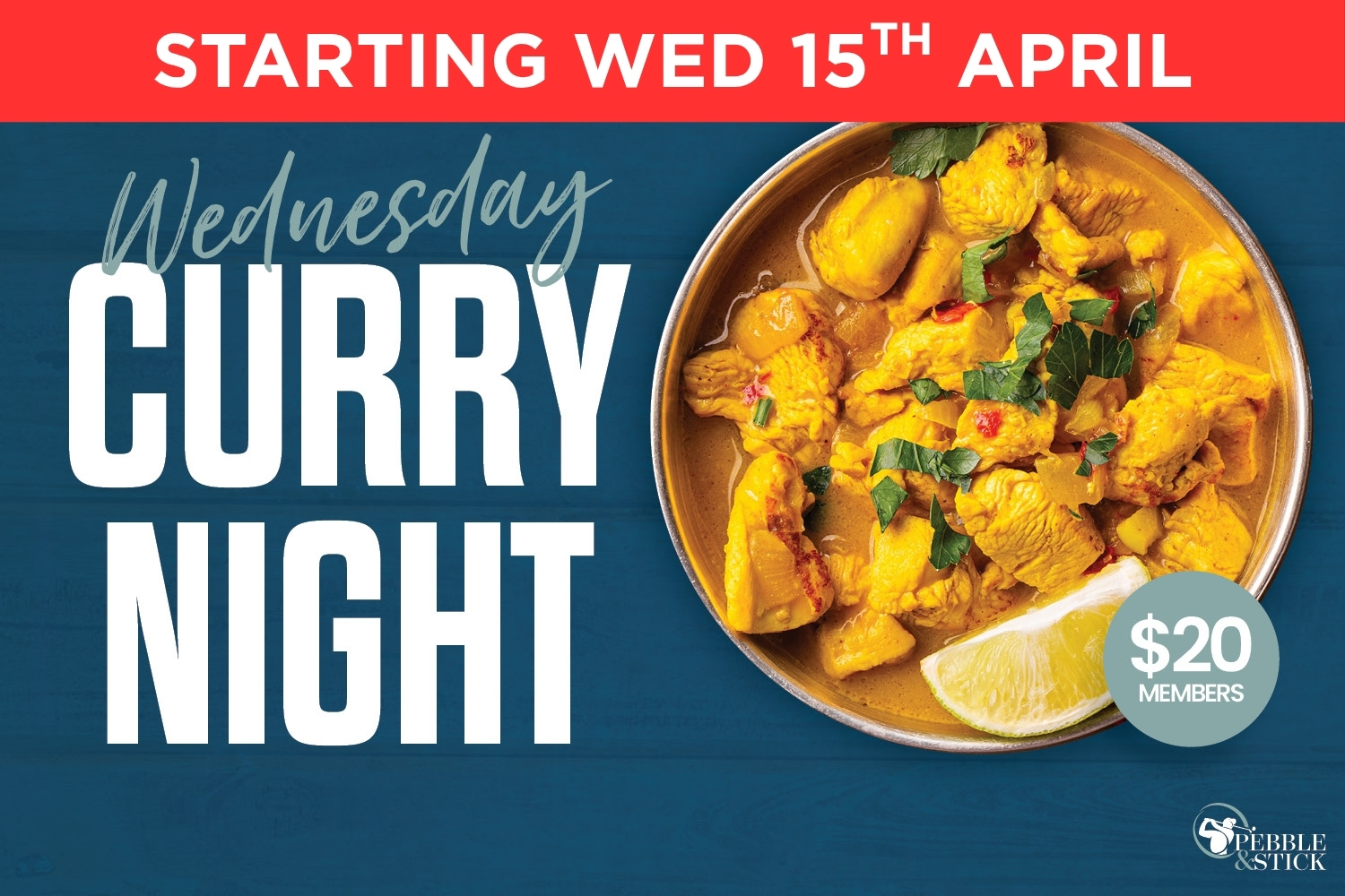 On Wednesday nights from 5:30pm, treat yourself to one of our delicious curries for only $20! Curries will be changing every Wednesday, so keep an eye out!